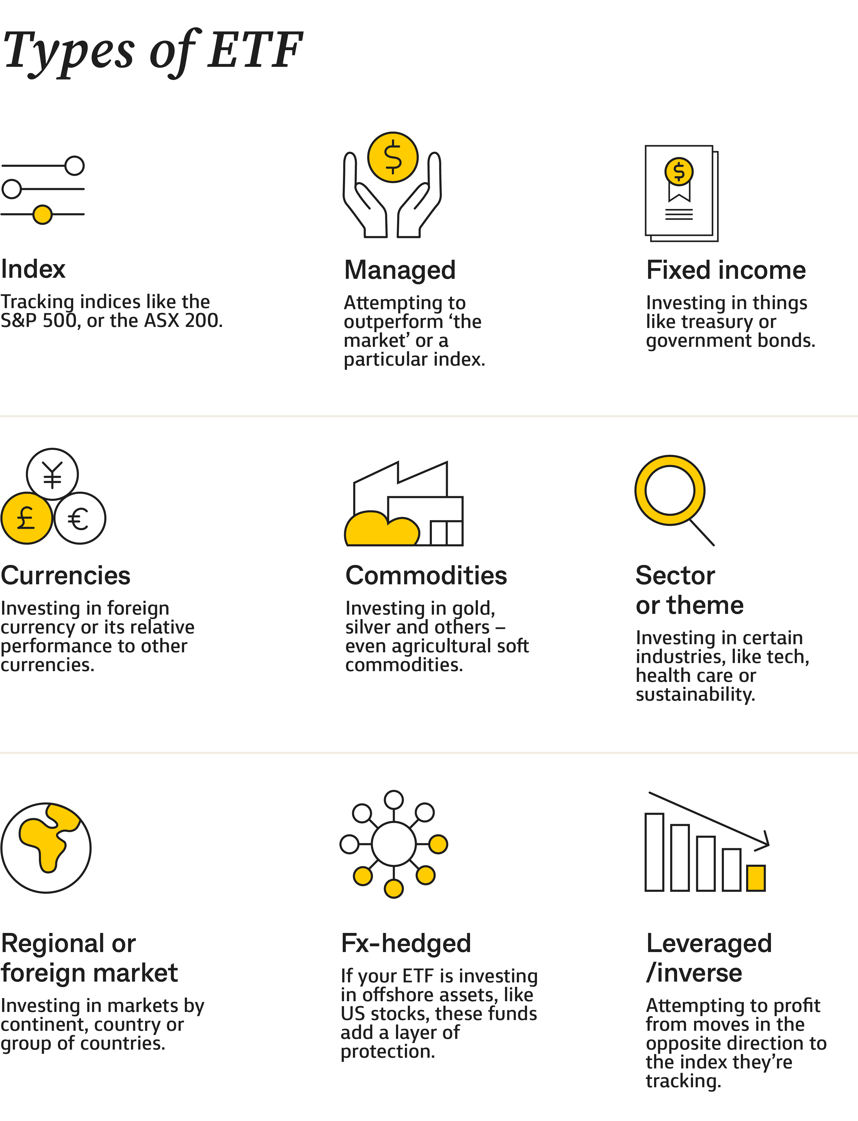 Fx-hedged: If your ETF is investing in offshore assets, like US stocks, these funds add a layer of protection should the value of the Australian dollar change, which can affect the value of your investment.