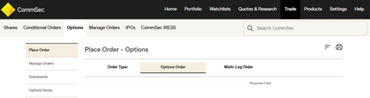 Options orders (incl. multi-leg orders) can be placed either online via CommSec website or over the phone by speaking to CommSec Options Support.