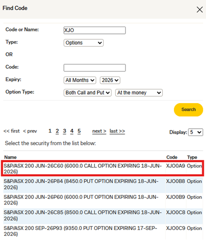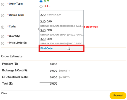 2. If you know the Options code, skip to step 4. If you don't know the Options code and need to search for a specific Option, enter the underlying code (e.g. XJO) and click the magnifying glass to search.