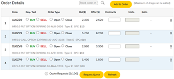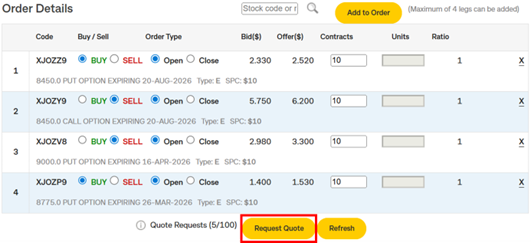6. Select BUY or SELL and Open or Close and add the number of contracts for each leg. Click Request Quote, wait 10 seconds then click Refresh (for a more in depth explanation regarding requesting quotes, visit our guide on how to request an exchange traded options quote.