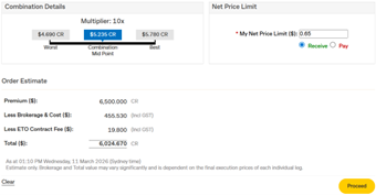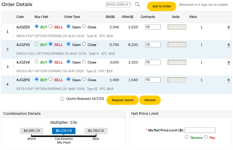 8. Enter your price in Net Price Limit and select Receive or Pay. Best, Worst and Combination Midpoint are provided to assist you in your decision making. For a more in depth explanation on Best, Worst, and Combination Midpoint, visit our guide on how to request an exchange traded options quote.