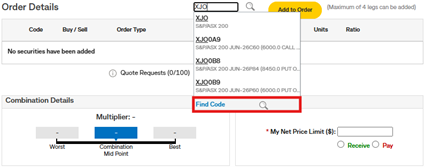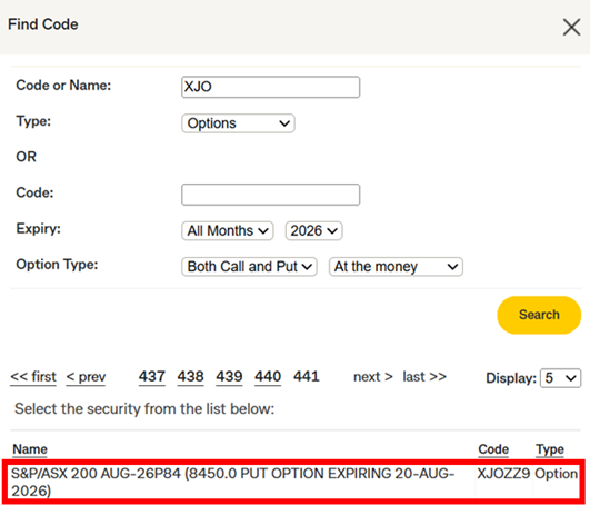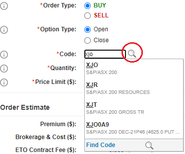 2. If you know the Options code, skip to step 4. If you don't know the Options code and need to search for a specific Options series, enter the underlying code (e.g., BHP or XJO) and click the magnifying glass to search.
