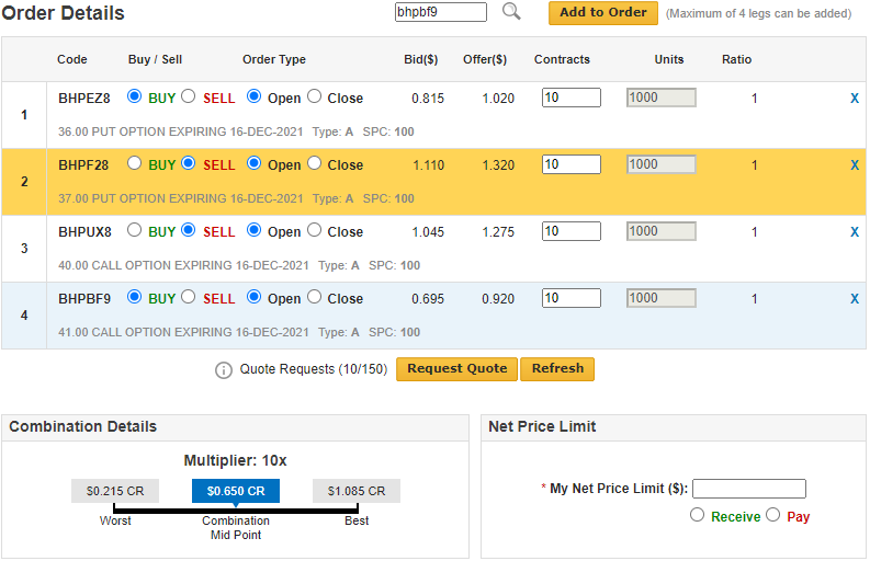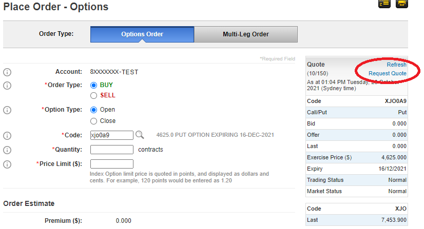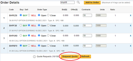 4. When you have decided which Options you would like to quote, enter the Options code and click the Request Quote button, wait 5-10 seconds then click Refresh.