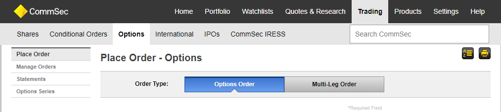 1. After logging in, click on Trading > Options > Options Order. (Note: you need an ETO account to be able to access this).