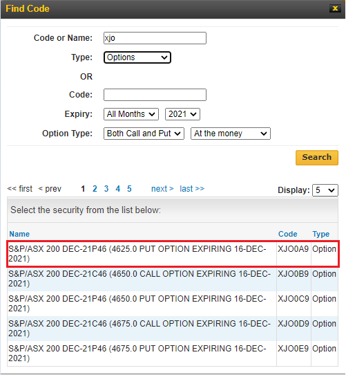 3. Under type, select Options and use the various search filters to find the Options series you wish to trade. From the list, click on the Options series that you are interested in to add it the order details screen.