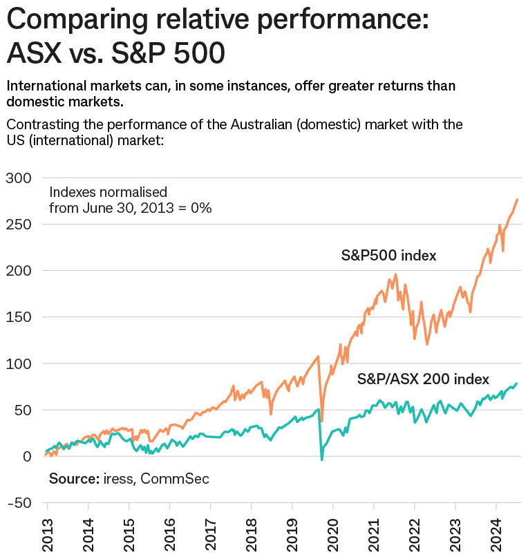 *10 year comparison based on monthly data ending 30 June 2023. The chart shows the relative performance of the ASX 200 Index (red) compared to the S&P 500 Index (green) In order to compare like for like, both indices have been rebased to a starting value of 1.
