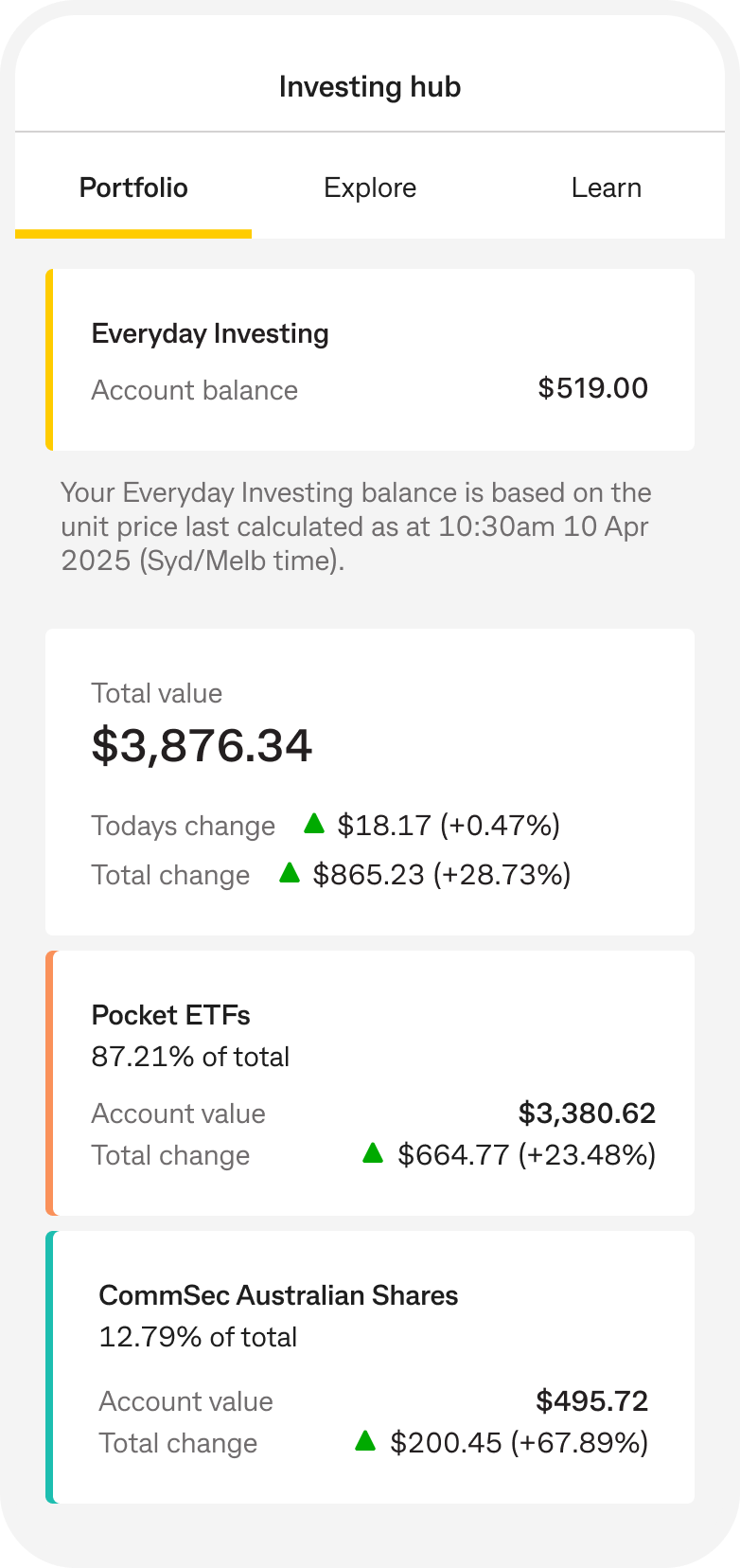 1 The investing experience in the CommBank app is only available for CommSec Pocket and Individual CommSec Australian Share accounts. Other CommSec account types are not currently available.