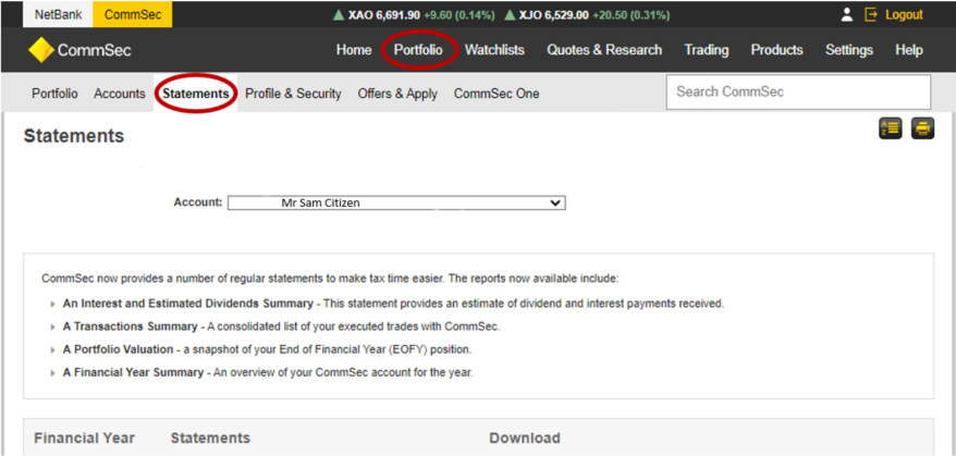 To view your statements, log in to CommSec, go to Portfolio, select Statements and then choose your trading account.