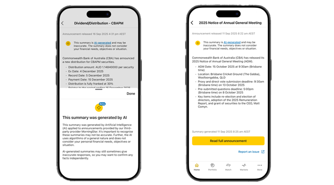 Stay ahead with AI-powered summaries of ASX announcements in the CommSec app. Just go to any company or stock page, scroll to ‘News & Announcements’, and tap ‘Summarise’ to get key insights on earnings, strategy, and leadership in seconds.