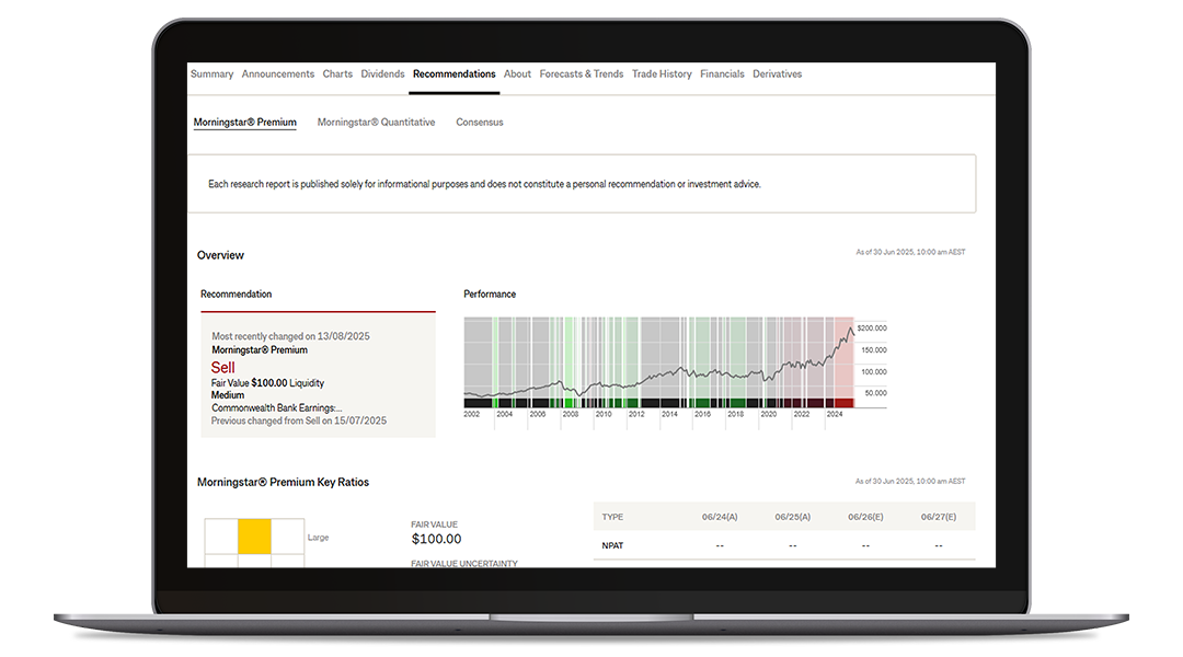 Morningstar Premium is now upgraded on CommSec’s app and website. Access comprehensive research on 1,000+ Aussie and US stocks (including ratings, market updates, and more) for $29.95 per month.