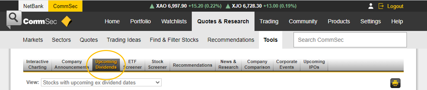 To locate 'Upcoming Dividends', navigate to 'Quotes & Research > Tools > Upcoming Dividends'